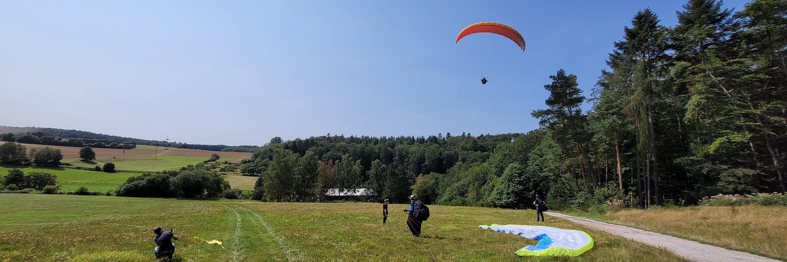 Startleiter, Windenführer und Pilot verfolgen den Seilverlauf besonders intensiv bis es sich vom Boden gelöst hat und sich nirgends mehr verfangen kann. Spätestens wenn das 2te Seil weg ist, macht sich der nächste Pilot startbereit. Schirm ausgelegt u. Leinen sortiert, Gurtzeug aufnehmen, Gleitschirm einhängen, Schleppklinke einbauen, Funk einschalten, Helm auf … Der Startleiter kontrolliert !