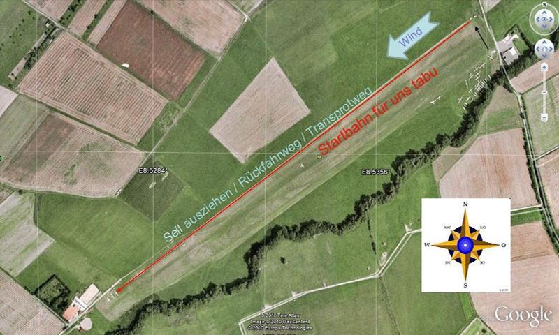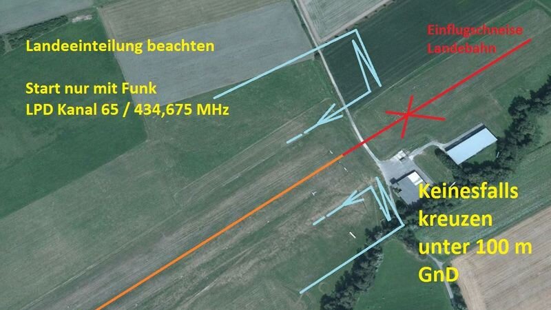 ACHTUNG ! Die Start/Landebahn muß für landende Flugzeuge freigehalten werden. D.h. zwischen den rot-weißen Tonnen ist der Aufenthalt verboten. Sollte da doch ein Gleitschirm landen müßen, bitte sofort räumen. Sollte die Bahn im Flug gequert werden müssen, dann Mindesthöhe 100 m, sonst auf der aktuellen Seite landen, es ist genug Platz, notfalls Aussenlandung und zurücklaufen (sportlicher Teil). Querungen der Startbahn am Boden nur nach Check in beide Richtungen, daß kein Flugzeug startet oder landet Flugzeuge im Anflug sind zu beachten und haben Vorfahrt. Der Flugplatz darf nur von Mitgliedern des LSC befahren werden.
